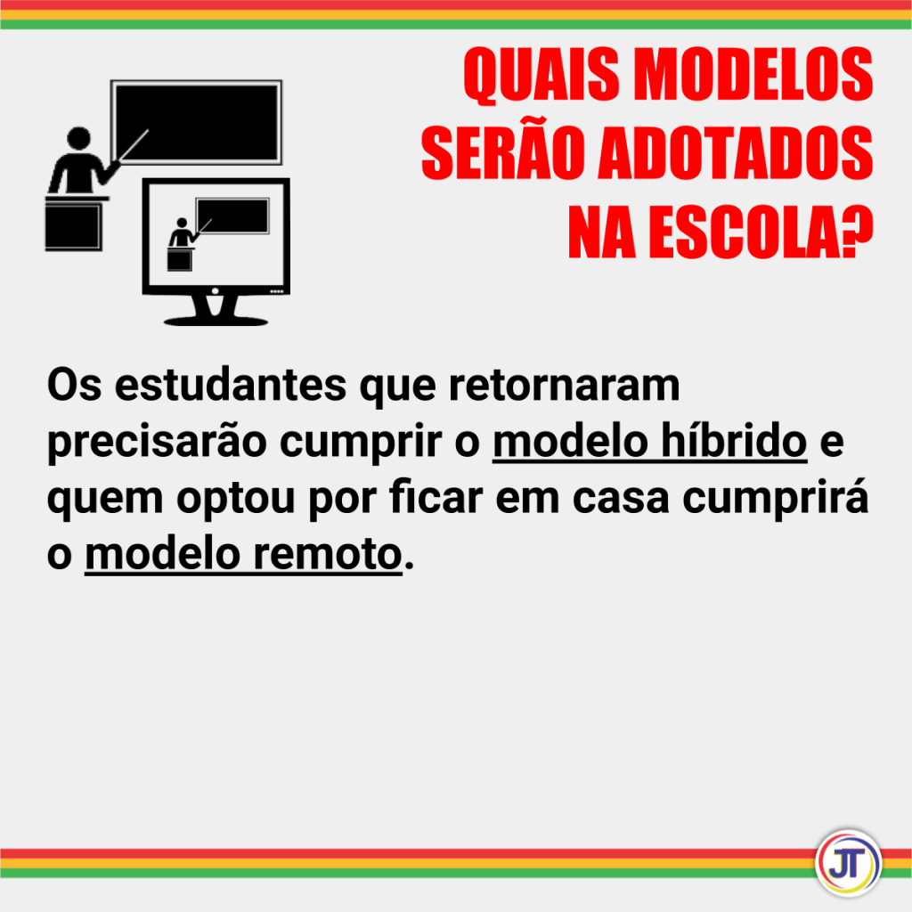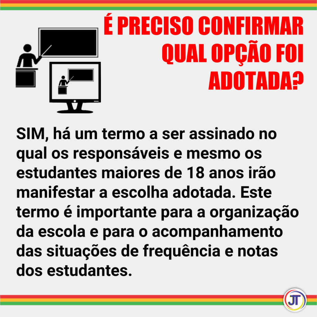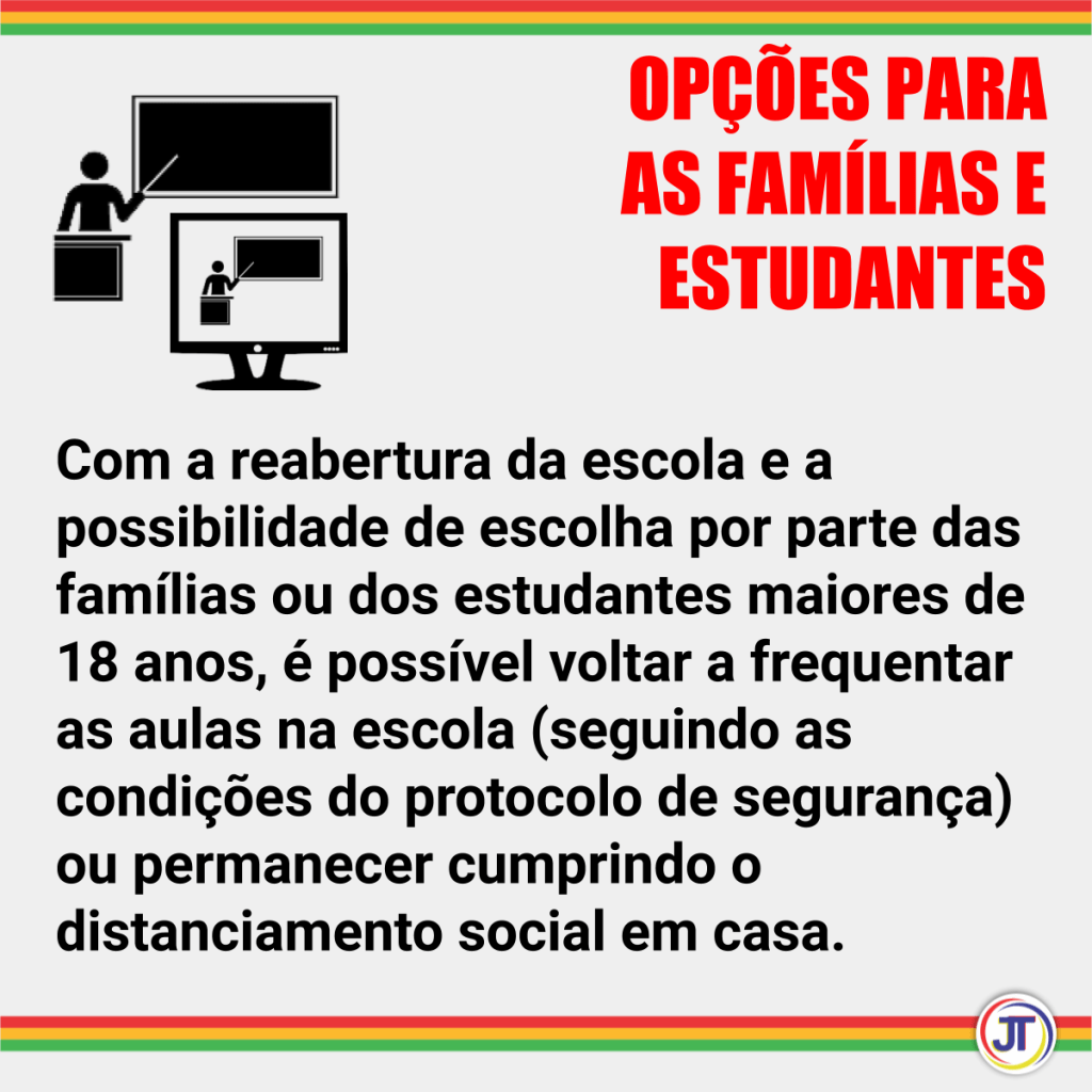Mesmo com a reabertura para o funcionamento presencial da escola, o retorno é uma uma opção das famílias e dos estudantes maiores de 18 anos durante a situação de pandemia do Covid-19. De qualquer forma a escola e os professores deverão garantir a oferta do ensino remoto para complementar as cargas horárias presenciais e atendimento aos que permanecerão em casa.